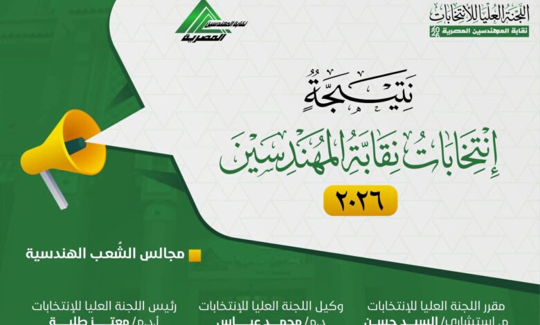- النتائج الكاملة بالأرقام: تعرّف على عدد أصوات الفائزين في انتخابات نقابة المهندسين 2026 لكل الشعب (مدني، كهرباء، ميكانيكا، عمارة). تقرير فني شامل للمهتمين والملاك.
